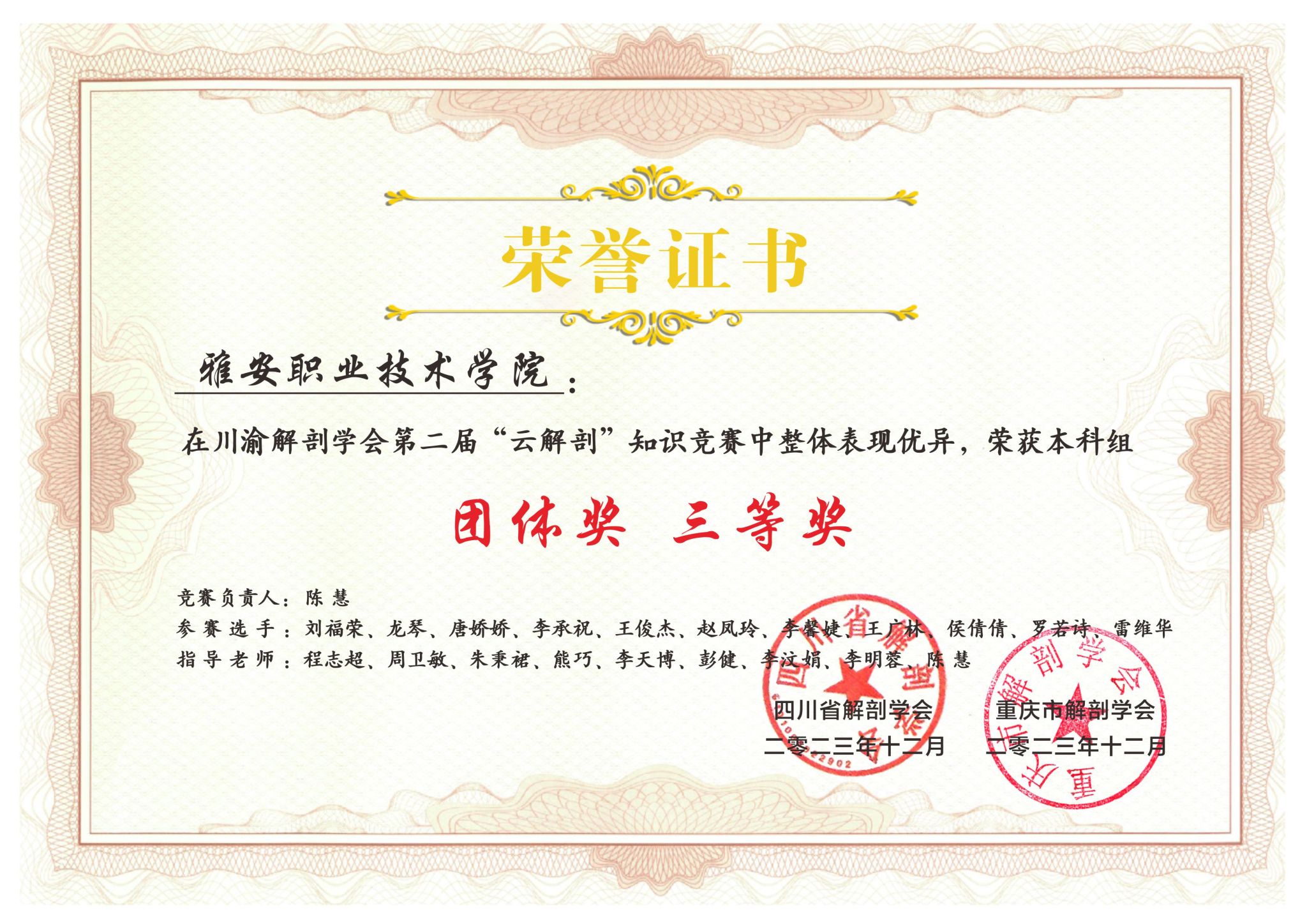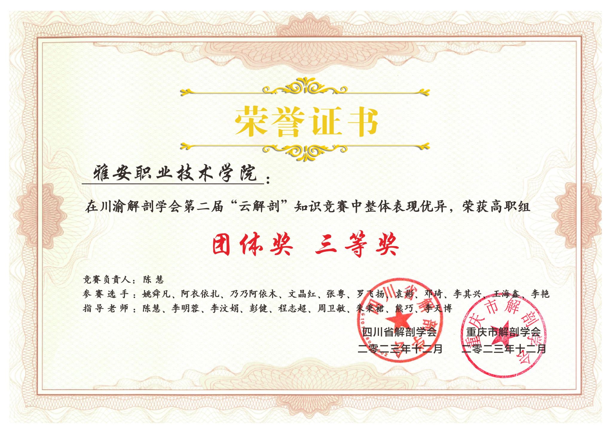 2023年川渝解剖学会学术年会于12月15至17日在重庆涪陵第三军医大学召开。大会对川渝第二届“云解剖”知识竞赛的获奖单位进行了颁奖,学院获本科组竞赛和高职组竞赛三等奖。
