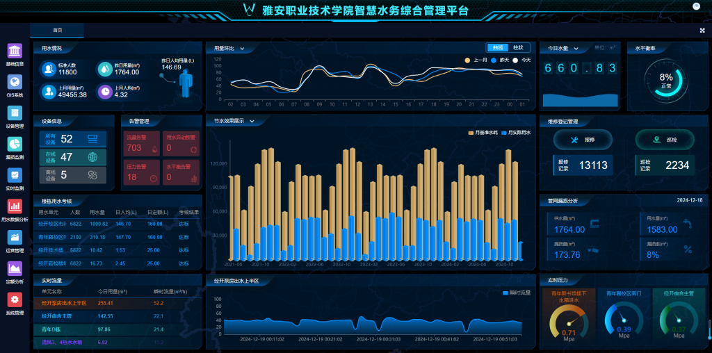 四是智慧后勤:基建后勤处利用现代信息技术,通过学校网上办事服务大厅平台,为采购审批、食品安全、工作订餐、报修维修、药品医疗器材申报等基建后勤事务提供统一应用场景,实现“全校一张网、数据一平台、事务一站式”的智慧管理服务格局,2024年,通过网络平台共处理各类事项700余件,提高了服务响应速度,确保师生的后勤需求能够得到快速有效地解决。充分利用晨检机器人、学生食堂食品安全人工智能监管大平台、智能留样秤等全新食堂服务模式及载体,形成集采购、储存、加工、用餐、回收“五位一体”的食堂智慧化管理智能体系。上线了智慧水务综合管理平台,打造节水型高校,通过近4年的运行,取得明显成效,每年用水量已由2020年(在校生约9500人)约110万吨降至2024年(在校生约12000人)约45万吨,实现了在校生增加情况下,节约65余万吨用水量的优秀成果,达到了50%以上的节水率,经验做法获水利部合同节水管理典型案例。通过智慧化服务体系,切实推动“汗水后勤”向“智慧后勤”转变,实现服务流程的透明化和便捷化,提高服务效率和质量。