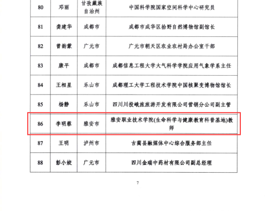 近期,四川省科学技术厅公布首批“天府科普使者”名单,学校生命科学与健康教育省级科普基地教师李明蓉成功入选。