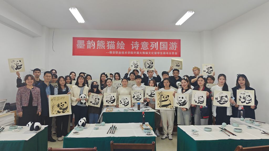 活动现场设置的知识竞答环节围绕大熊猫的历史渊源、生活习性、外交贡献等内容展开,通过趣味互动深化留学生对熊猫文化内涵的认知,获奖者获赠的熊猫主题纪念品也成为传播雅安大熊猫文化的特色载体。在“墨韵熊猫绘 诗意列国游”体验环节,留学生们挥毫创作憨态可掬的熊猫水墨画作,在笔触流转间感受中华传统文化魅力。