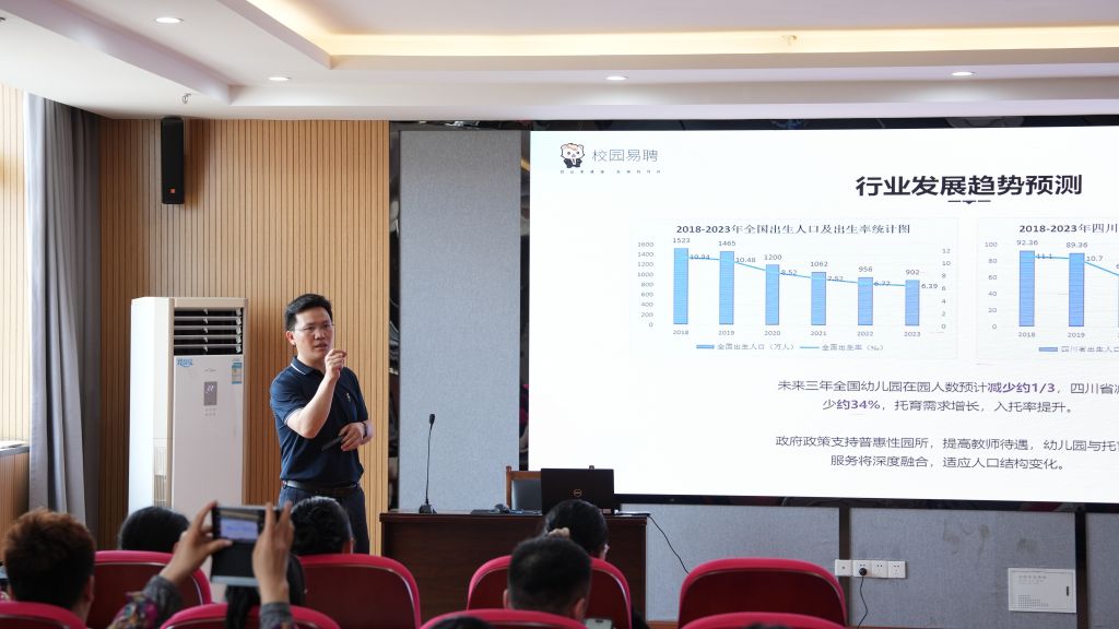 会上,锦兰艾柏教育管理有限公司总经理、四川省优生托育协会人才分会秘书长、四川省一老一小产教融合共同体副秘书长张川受邀作《托幼行业发展趋势与人才培养策略》的专题报告。张川结合翔实的数据,基于对托幼行业发展趋势的分析,分别从对托幼同行的运营建议、托幼人才的需求特征、人才培养体系的构建方法、产教融合的实践路径、协同发展的长效机制等方面进行了分享。