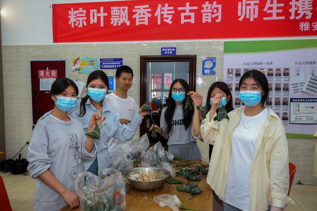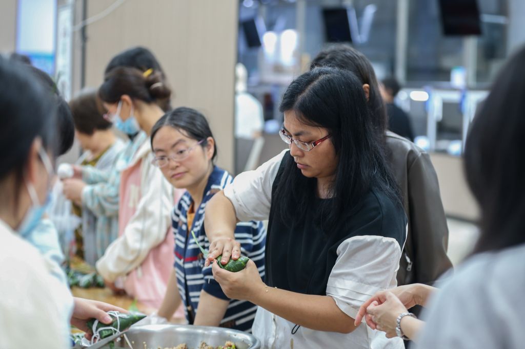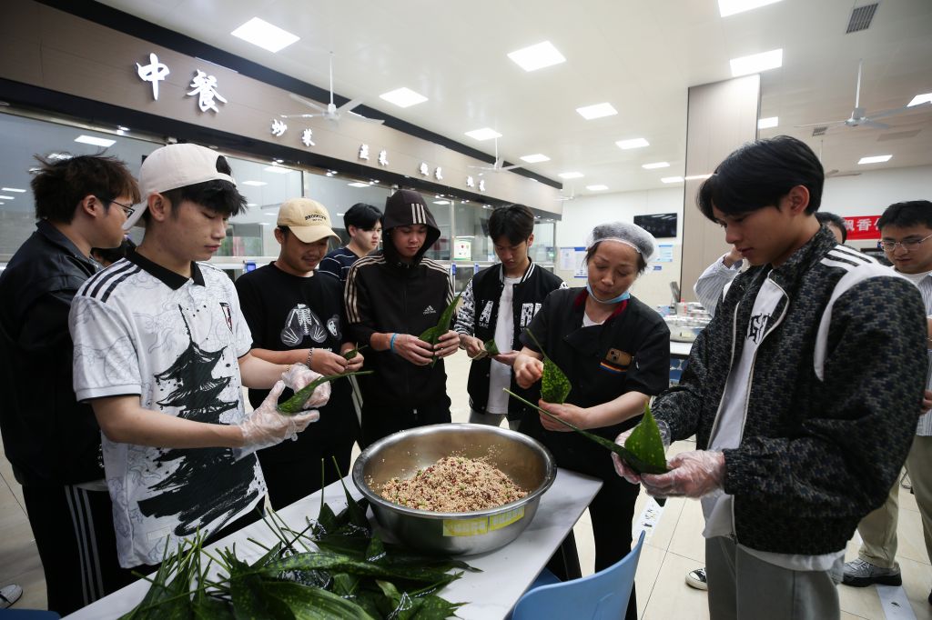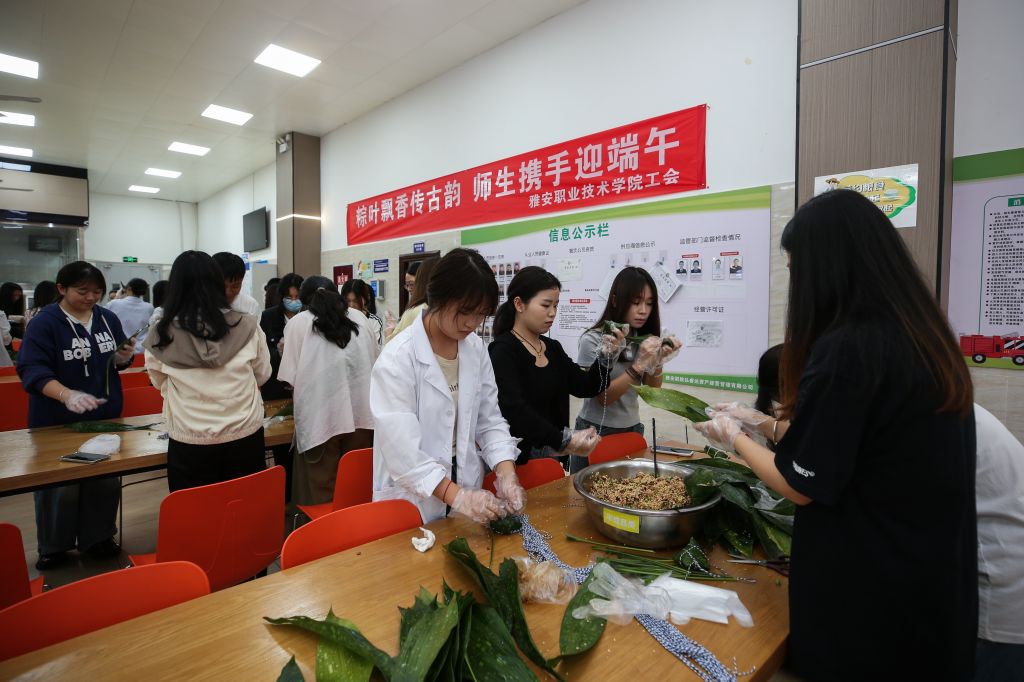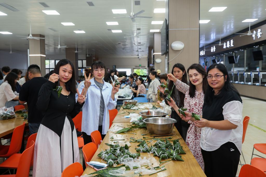 活动现场,粽叶飘香,气氛热烈。师生代表齐聚一堂、各显身手包粽子。活动得到后勤基建处的大力支持,食堂师傅提前准备好了粽叶、糯米、馅料等食材,老师和同学根据口味喜好调味、拌料。新手们围在经验丰富老师身旁学习请教,热心的能干人则手把手教学,在欢声笑语中,大家一边认真学习包粽子的动作要领、一边感受着端午节的独特氛围。活动中,师生们还自发地开展比速度、比工艺、比外形美观等小游戏,更增添了活动的趣味性。