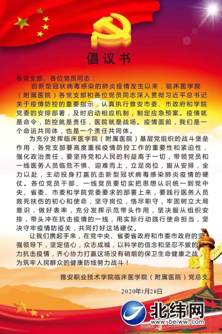 近日,新型冠状病毒感染的肺炎疫情引发社会强烈关注,也时时牵动着每一位医务人员的心。连日来,雅职院请战氛围热烈,雅职院附属医院医务人员、学院医卫 类教师,甚至在校医学生都纷纷表达了自己心声,自愿加入防控疫情的一线工作,随时听候医院调遣,为保卫人民群众的生命健康贡献自己的一份力量。