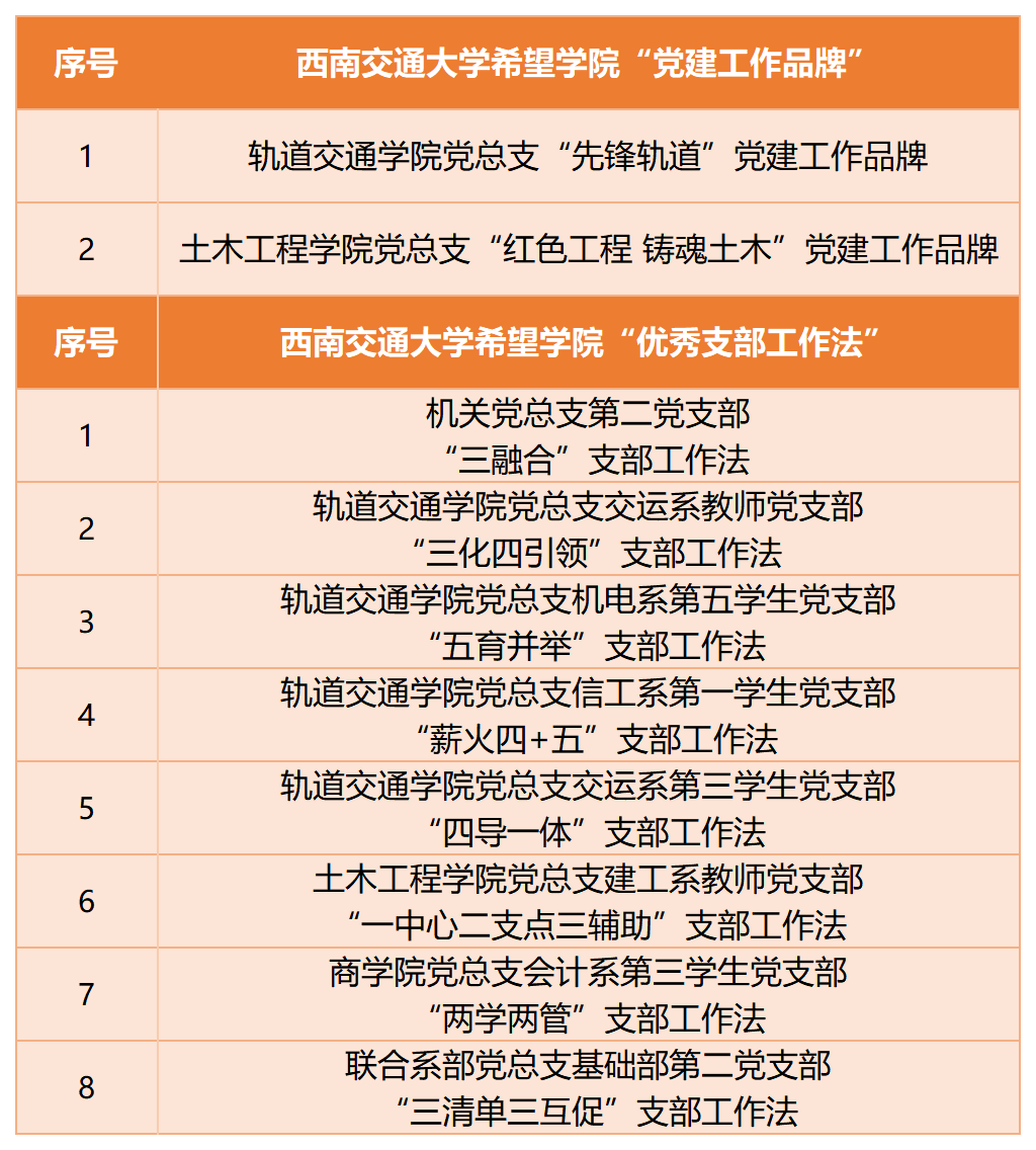 学院在各基层党组织推荐申报的基础上,评选出了轨道交通学院党总支“先锋轨道——党建引领·争做转型改革排头兵”、土木工程学院党总支“红色工程·铸魂土木”2个校级“党建工作品牌”和机关第二党支部“三融合”支部工作法、交运系教师党支部“三化四引领”支部工作法等8个校级“优秀支部工作法”。学院要求各党总支和各党支部结合自身实际,进一步挖掘党建工作特色、亮点,努力总结凝练打造具有较强示范价值的党建工作品牌和支部工作法,力争努力实现 “一个支部一套办法、一个支部一个品牌”。