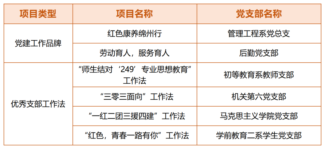 此前,四川幼专结合学校中心工作和办学特色,21个党支部对标对点、认真提炼,秉承“党建+业务”理念,聚焦人才培养、教育教学改革、内部管控、服务师生、服务地方等重点工作,总结形成了“党建工作品牌”8个、“支部工作法”18个。最终,确定2个校级“党建工作品牌”、4个“优秀支部工作法”进行重点培育打造,学校组织人事处对6个创建项目全程指导、定期验收,并配套建设经费。