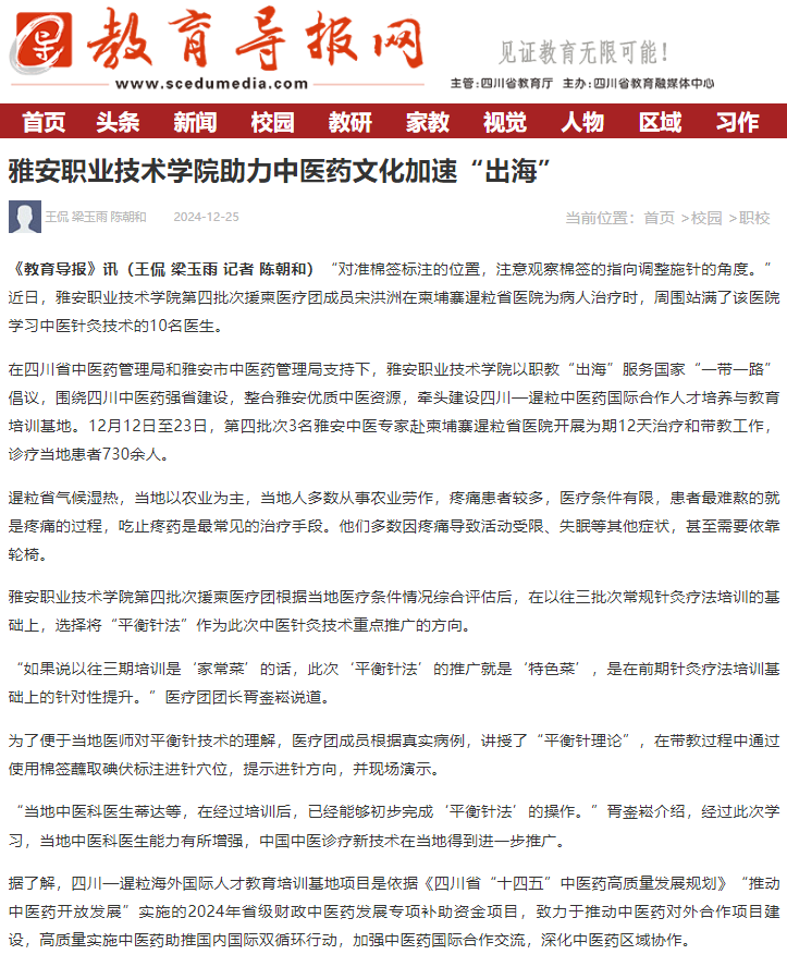 在四川省中医药管理局和雅安市中医药管理局支持下,PP电子游戏网站以职教“出海”服务国家“一带一路”倡议,围绕四川中医药强省建设,整合雅安优质中医资源,牵头建设四川—暹粒中医药国际合作人才培养与教育培训基地。12月12日至23日,第四批次3名雅安中医专家赴柬埔寨暹粒省医院开展为期12天治疗和带教工作,诊疗当地患者730余人。